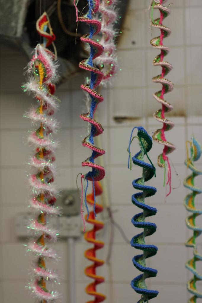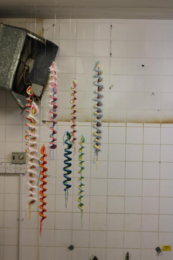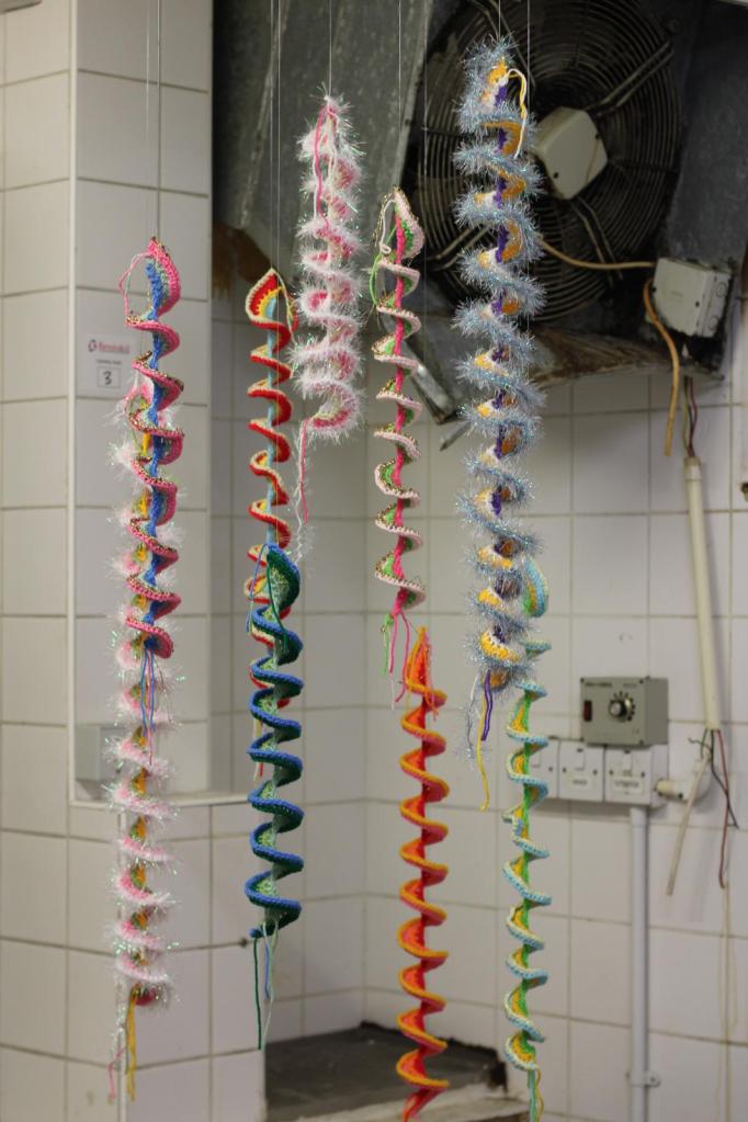 Spiraling up & down, 9 crochet swatches using cotton, acrylic and tinsel yarn, installed in Kingdom Hall, February 2025, approximately 2 x 1 x 1 m, size variable on install, 2025.