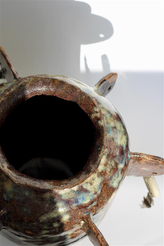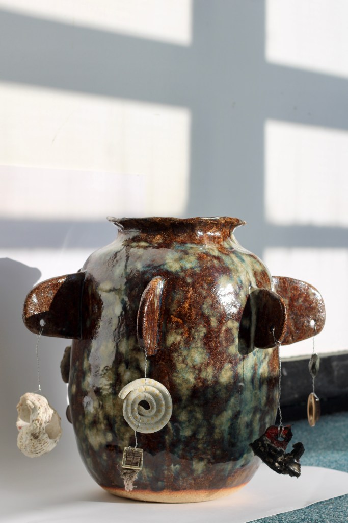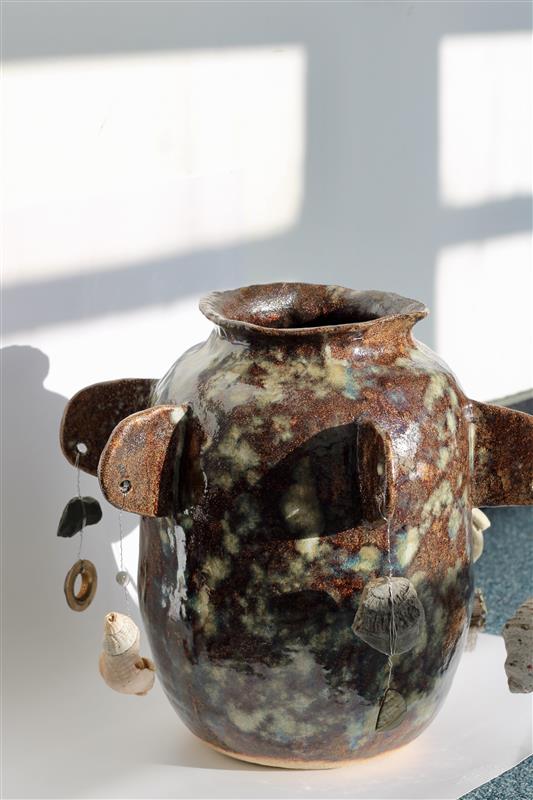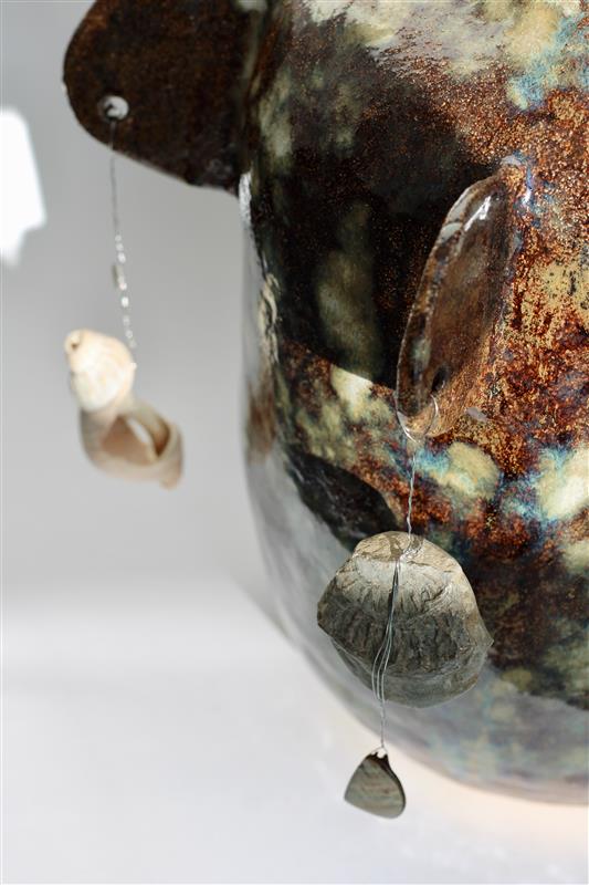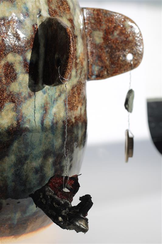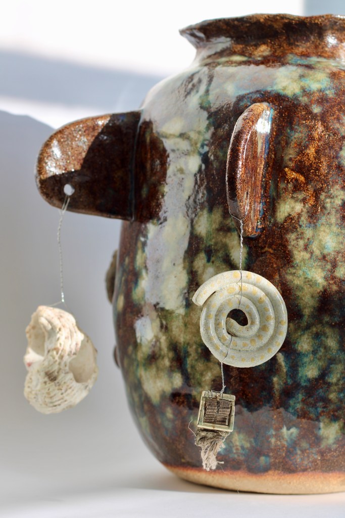 Charm pot, Crank with stoneware glazes, silver wire, and charms: