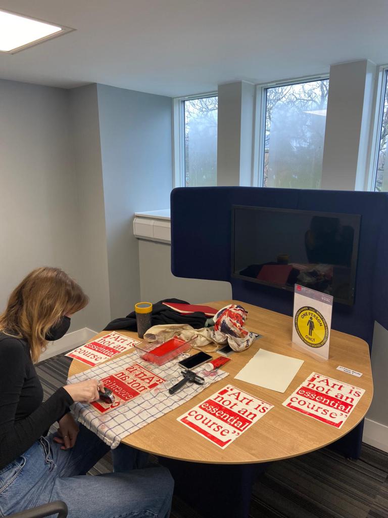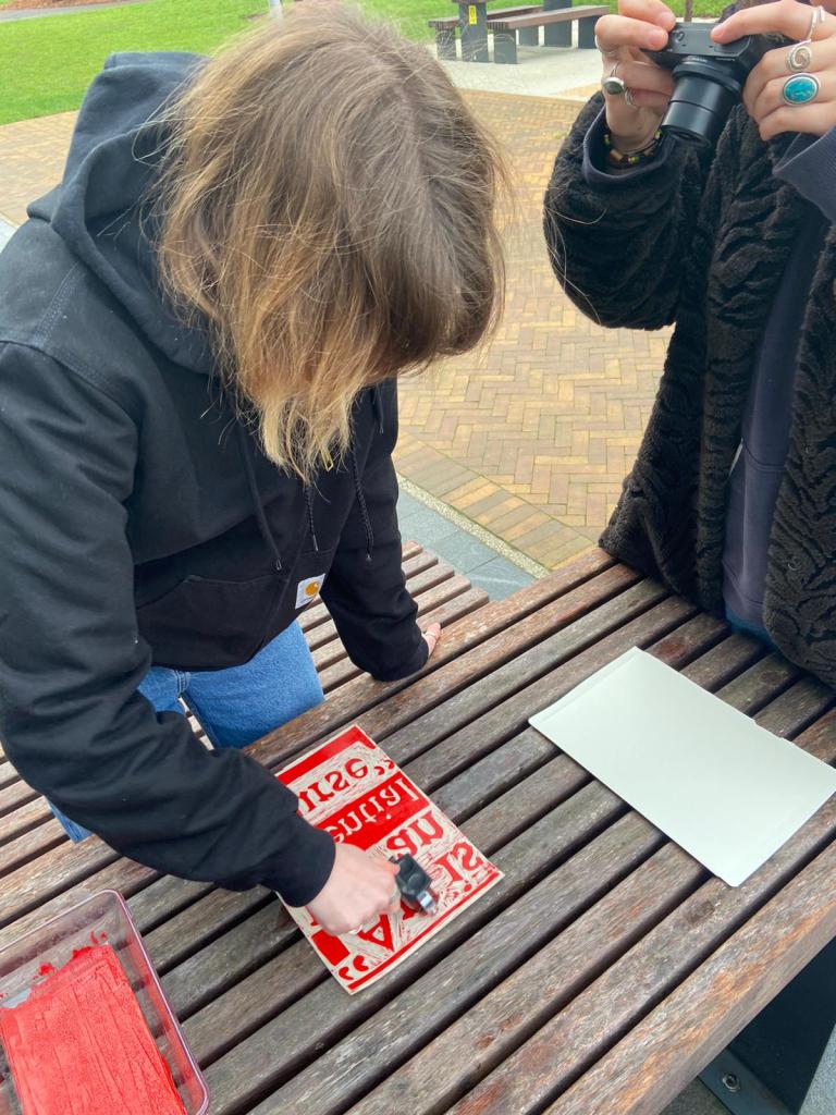 Photos from library presentation, where lino prints were made inside the library, as well as outside, as an attempt to highlight the disparities between study spaces/facilities which were able to be open at the start of term