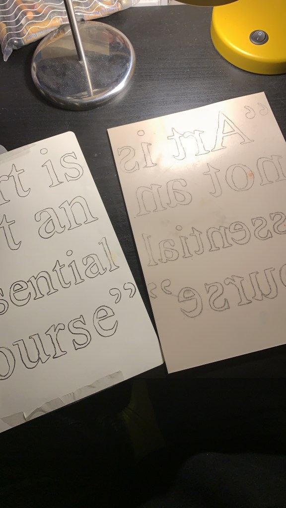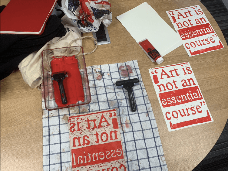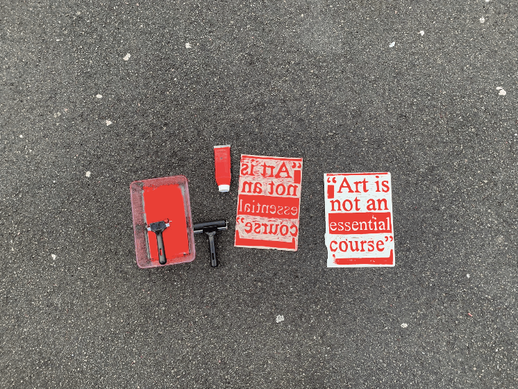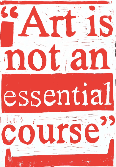 “Art is not an essential course” lino print, 20 x 30 cm, on paper, Feb 2021; quote taken from a school meeting, said in response to questions about why the studios must be closed