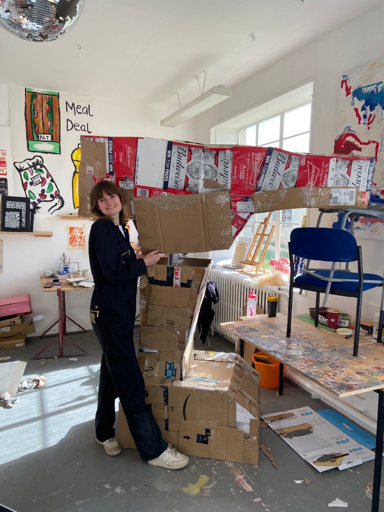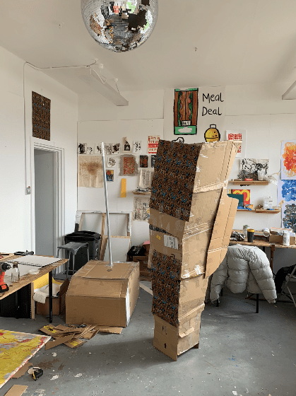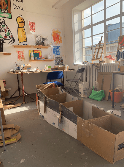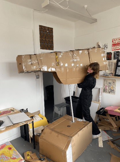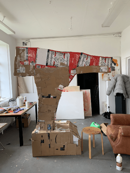 Base layer, predominantly consisting of cardboard and tape, with plastic piping in the middle for structure