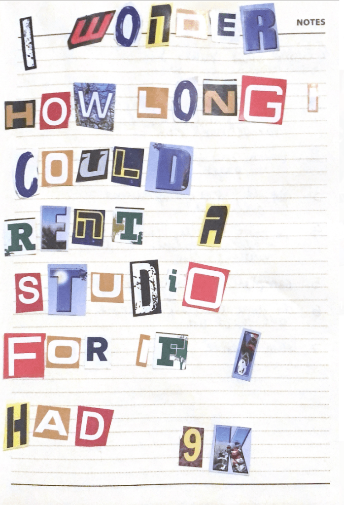 “I wonder how long I could rent a studio for if I had 9k”, analogue collage, 20 x 15 cm, Feb 2021; a collage to further share frustrations on studio closures