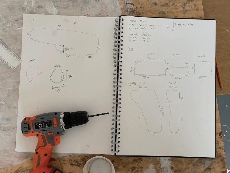 The drill in question, with the initial sketches/sizing below