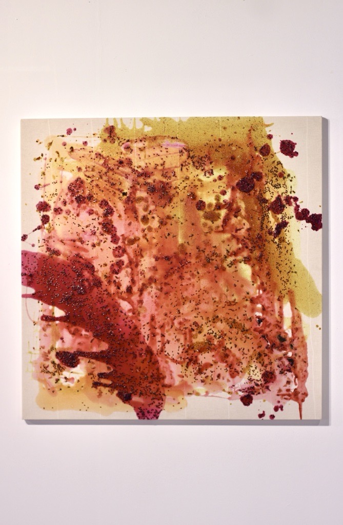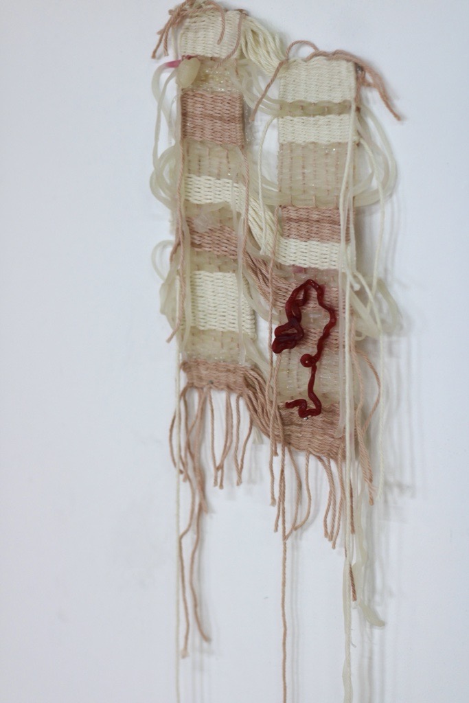 As this was the first occasion of creating biomaterials outside of my usual sites of working, one of the first major influences I encountered was the environmental impact of the gallery space. The agar agar drying times were significantly increased, once set they could be prone to melting, and nearly all of these pieces grew some mould (subsequently killed with vinegar). As for the chia seed tapestry experiment, where, when I tested this technique, the seeds would take root on the cotton fabric and then grow into microgreens, during the residency the seeds died, and started to rot on the fabric (I think I had overwatered them, as I was used to warmer climates). Not only did this create an entirely different visual effect from what I had expected, but it also gave off an odour, which became quite stimulating in the space. A very sweet, kind of decaying, vegetal/compost scent which was hard to avoid when looking at any of the works in the gallery. It seemed to teeter between being a disrupting and complementary stimulus alongside the other work. Therefore, the environment became a collaborator in the pieces, being an intervention in the materiality of the work which I had to reason with, bringing into focus the idea of how we live amongst wider ecosystems, and often how we are blind to this relationship with nature.
