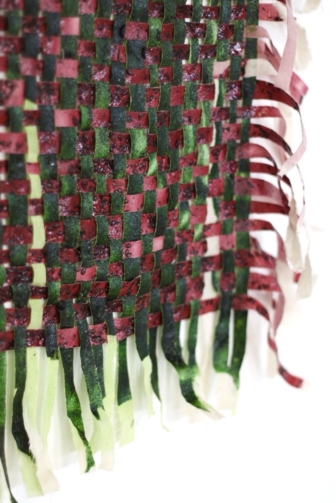 The body of work produced throughout the residency consists of three main processes: the ‘drawings’ – agar agar pigments and plastics set onto recycled cotton and calico fabric; the ‘weavings’ – alginate yarn and cotton, or agar agar fabric, woven together; and the ‘fabrics’ – the agar agar plastic set into thin sheets.