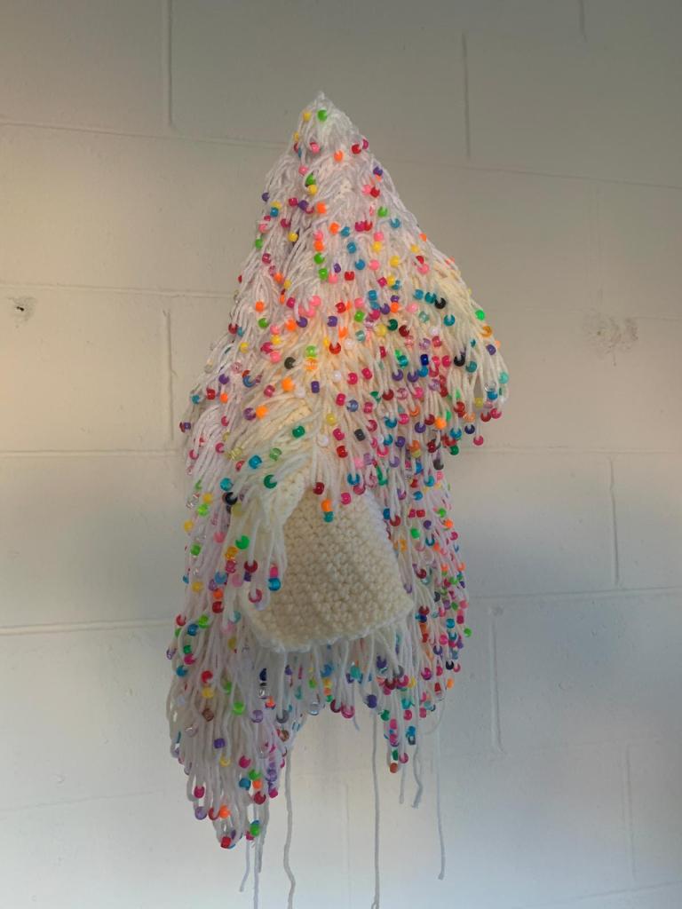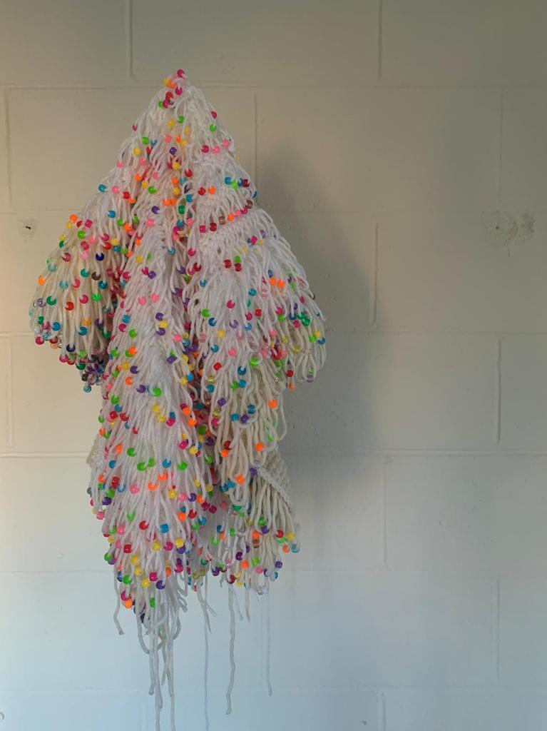 Eyes Pricked With Tears, crocheted acrylic, cotton and wool yarn and pony beads, fabric measures 90 x 50 cm, size variable depending on install, 2024.
