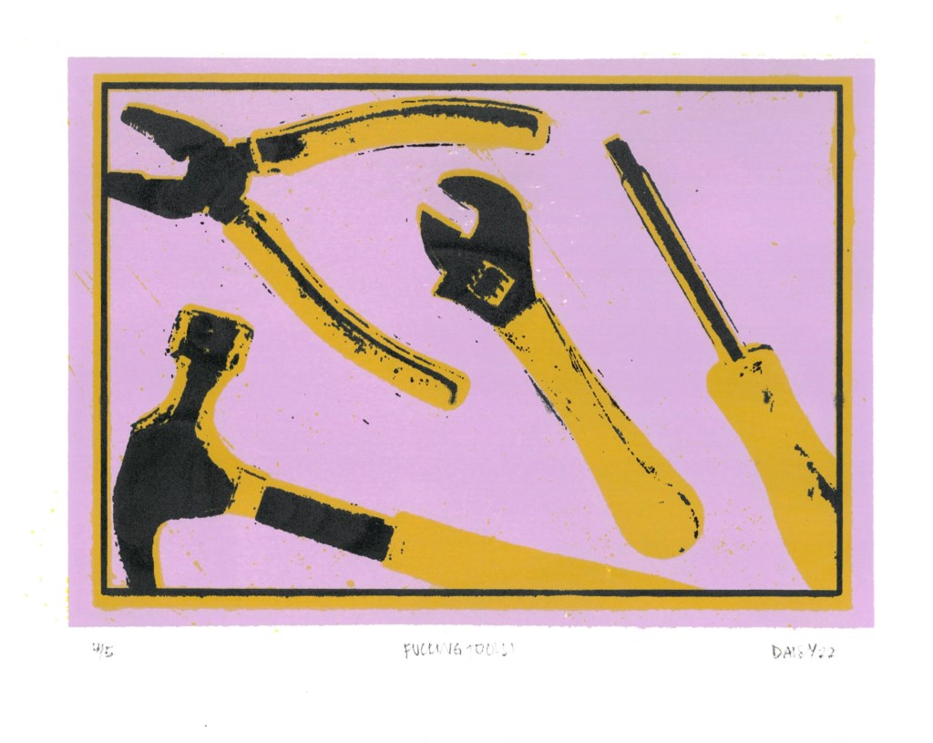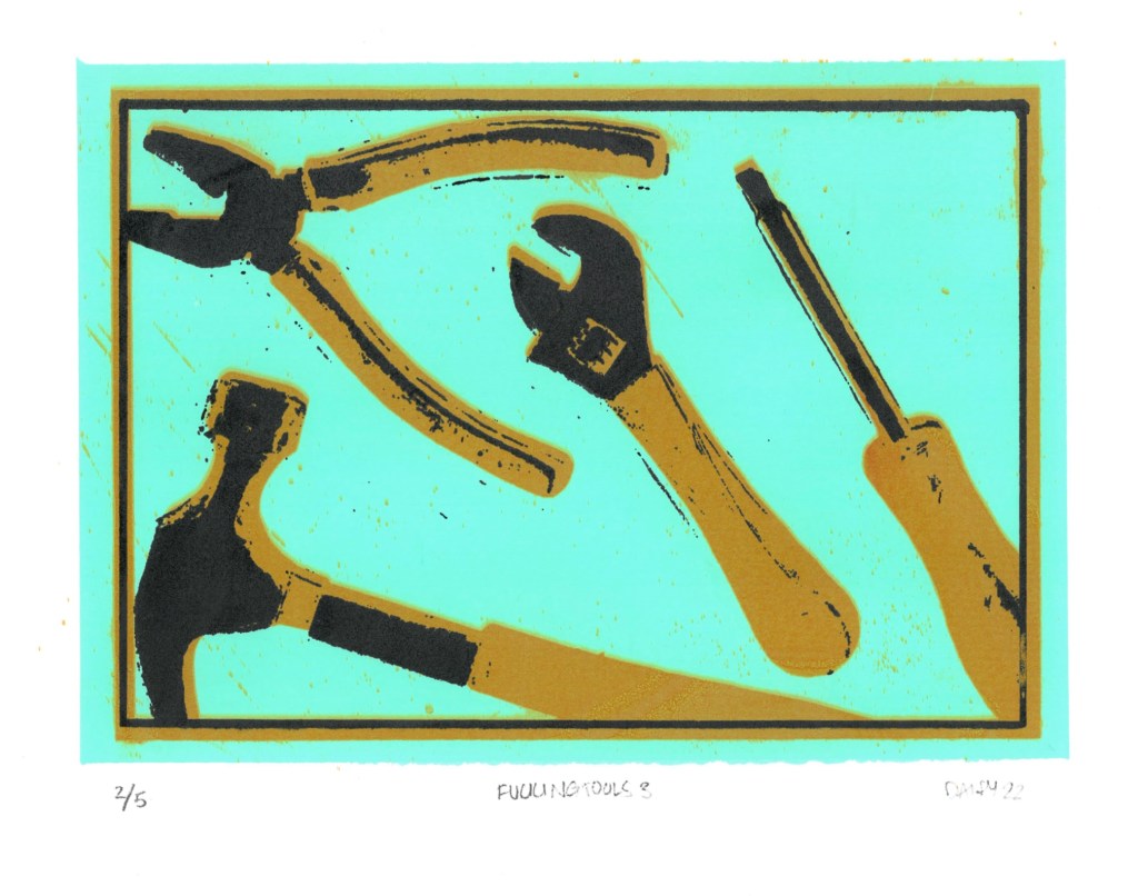 WorkContactCV Fucking Tools, 3 layer screen print on Fabriano Rosapina, 28 x 35 cm, 2022. Three sets of 5 editions each. Share this: Share on X (Opens in new window) X Share on Facebook (Opens in new window) Facebook Like Loading...