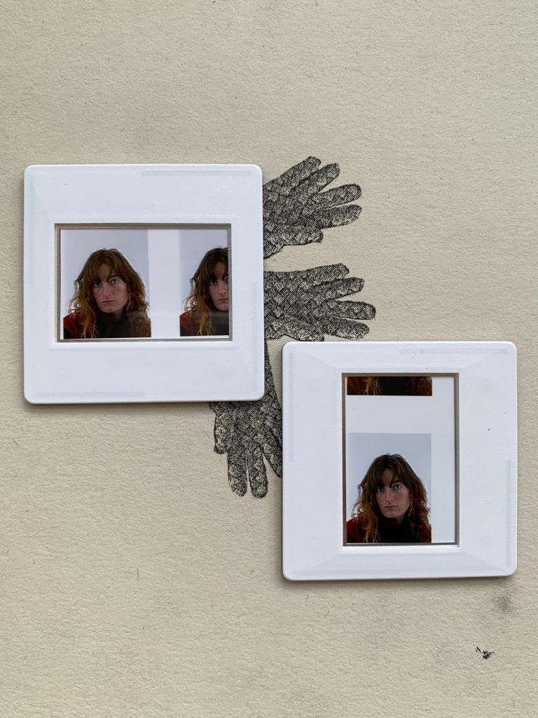 Glow Stick (Self Portrait 2), photo booth pictures taken in a pharmacy on Tottenham Court Road, mounted in slides, 4 x 4 cm, 1/10/2024.