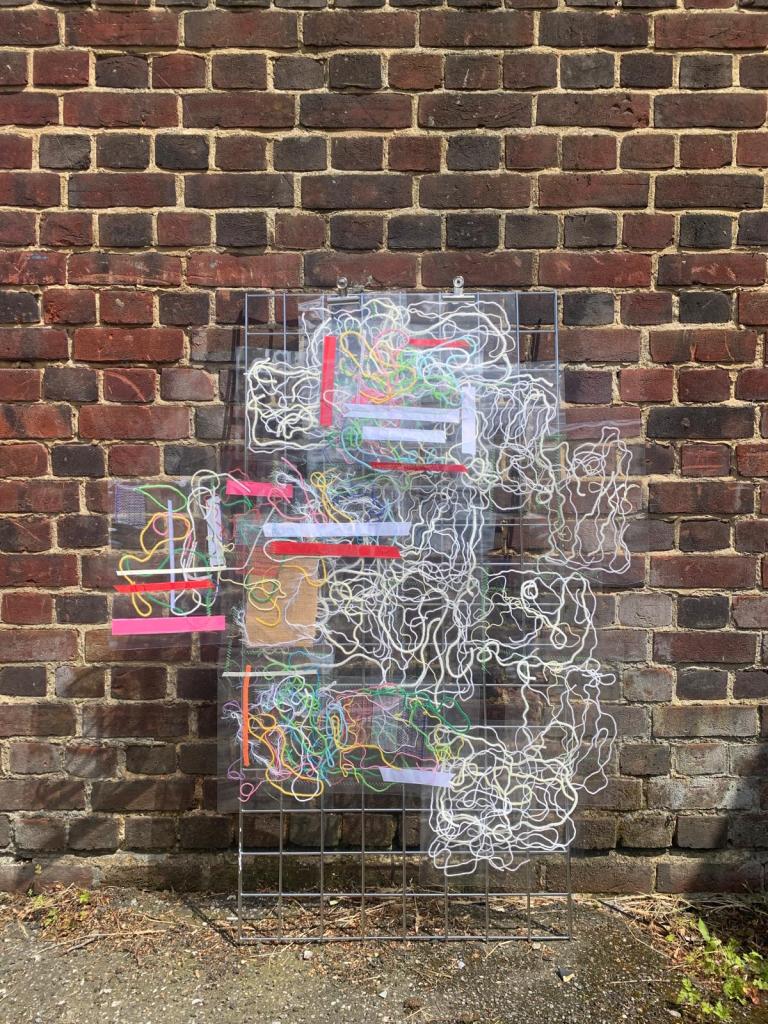 Here but not really here, laminate sheets, yarn, ribbon, scrap fabric and thread, dimensions varying, installed at Kingdom Hall, 2024.