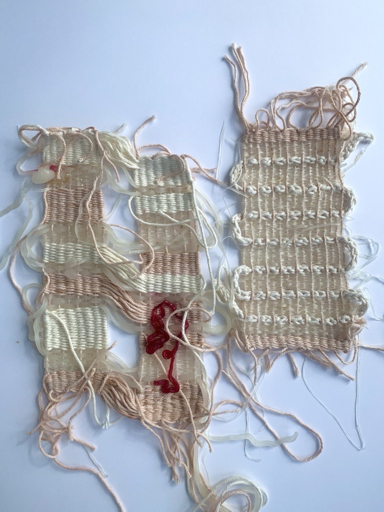 Home is the moon, onion skin dyed cotton yarn, white cotton yarn, alginate yarn with edible glitter, alginate and beetroot, 20 x 12 cm and 16 x 10 cm.
