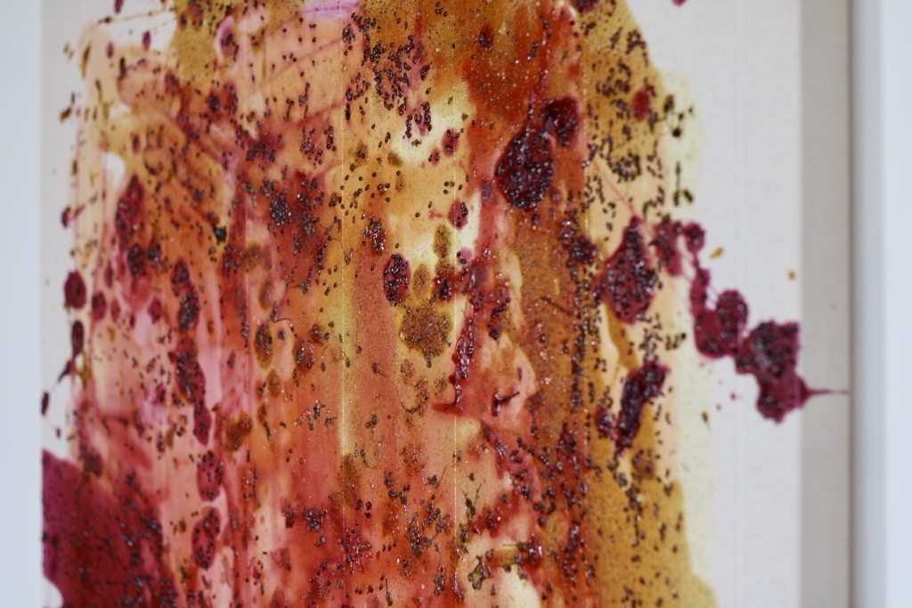 It can’t catch a moving target, agar agar, tea leaves, food colouring, flaxseed and camomile flowers on recycled cotton, 100 x 100 cm