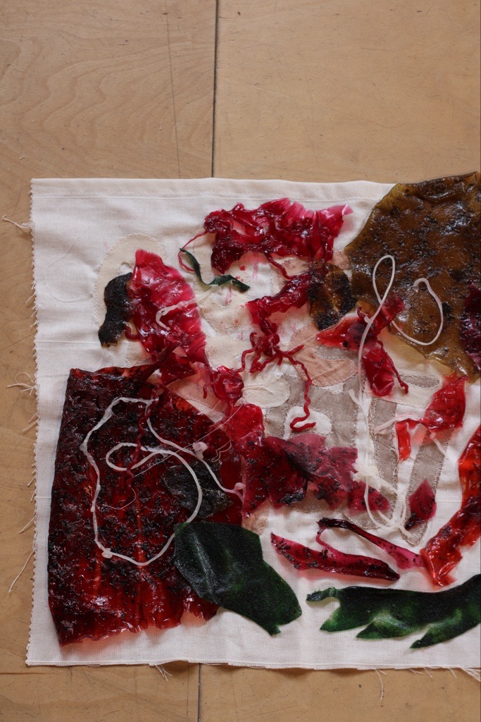 Scrapheap services, installation featuring overhead projector, biomaterial offcuts made from agar agar, alginate and natural dyes and fabric, dimensions variable