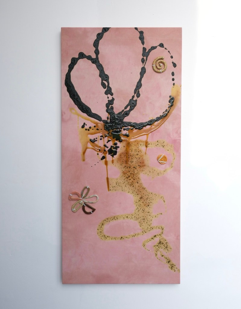 Sticky Pulp, Red onion and sumac dyed calico with spirulina and fenugreek agar agar bioplastic and stoneware glazed ceramic and thread, 130 x 60 cm, 2026