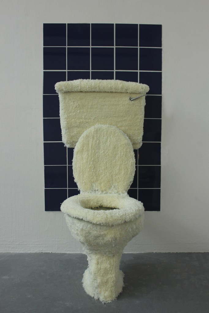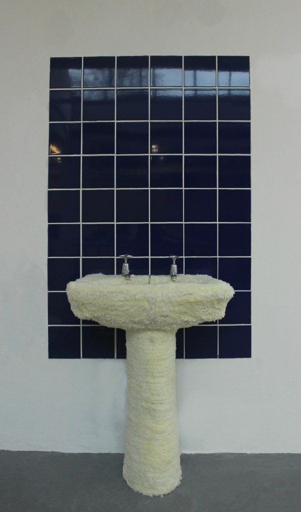 Shit Soft, collaborative piece with Catalina King, installation featuring tufted pieces, toilet, sink and tiling, 2 x 1.5 m, 2022.