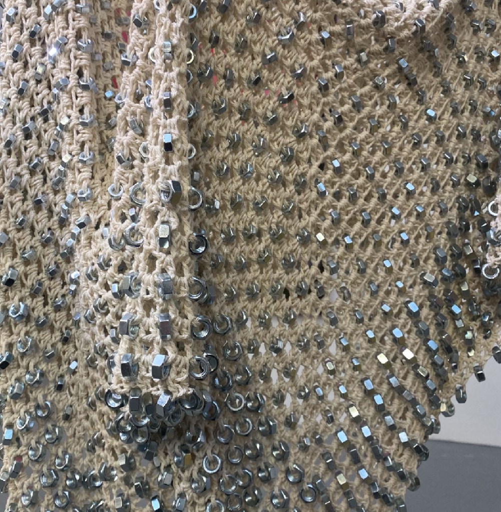 Waited Blanket consists of cotton string which has been crocheted into a blanket, with the addition of steel hexagonal nuts, of various sizes. It aims to highlight the contradictions between these materials in a very simplified way; the cold metal of the nuts contrasts the traditional warmth of the blanket; the weight the metal brings makes the object redundant as a blanket; an item which is supposed to be soft has been hardened. The abstracted nature of this piece aims to create a sensory experience, with the main focus being on the materiality, as opposed to the appearance of the work, whilst still holding the connotations of female and male dominated crafts, and the time and labour which goes into them.